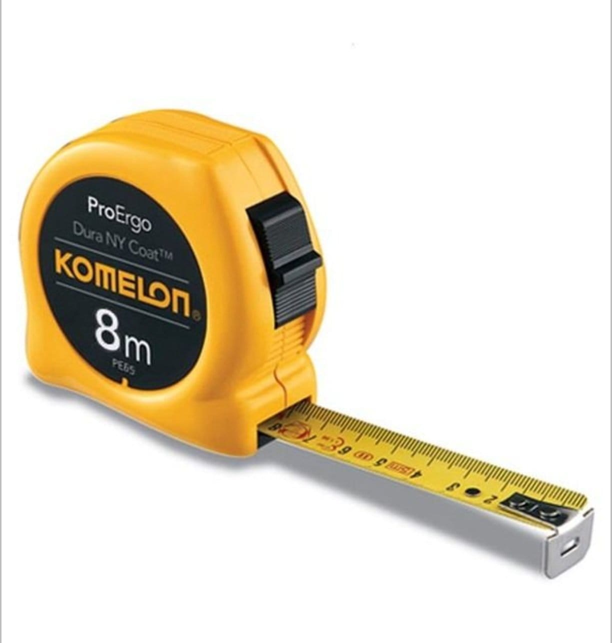 Mètre ruban Komelon 8m x 25 mm, boîtier jaune ergonomique, ruban enduit Nylon Dura NY Coat™ pour une durabilité maximale. Parfait pour les chantiers.
