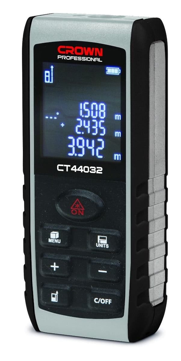 Télémètre laser CROWN CT44032, portée 40 m, affichage rétroéclairé et fonctions de mesure avancées. Compact, précis et idéal pour les chantiers, artisans et installateurs.